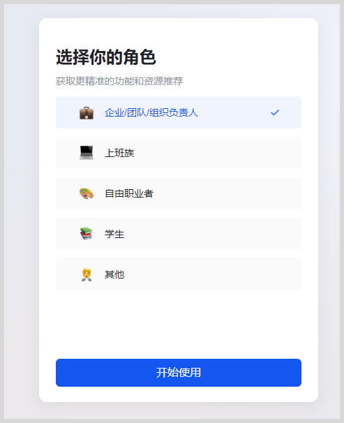 2、登录后,选择您的角色:企业/团队/组织负责人,开始使用!