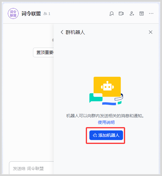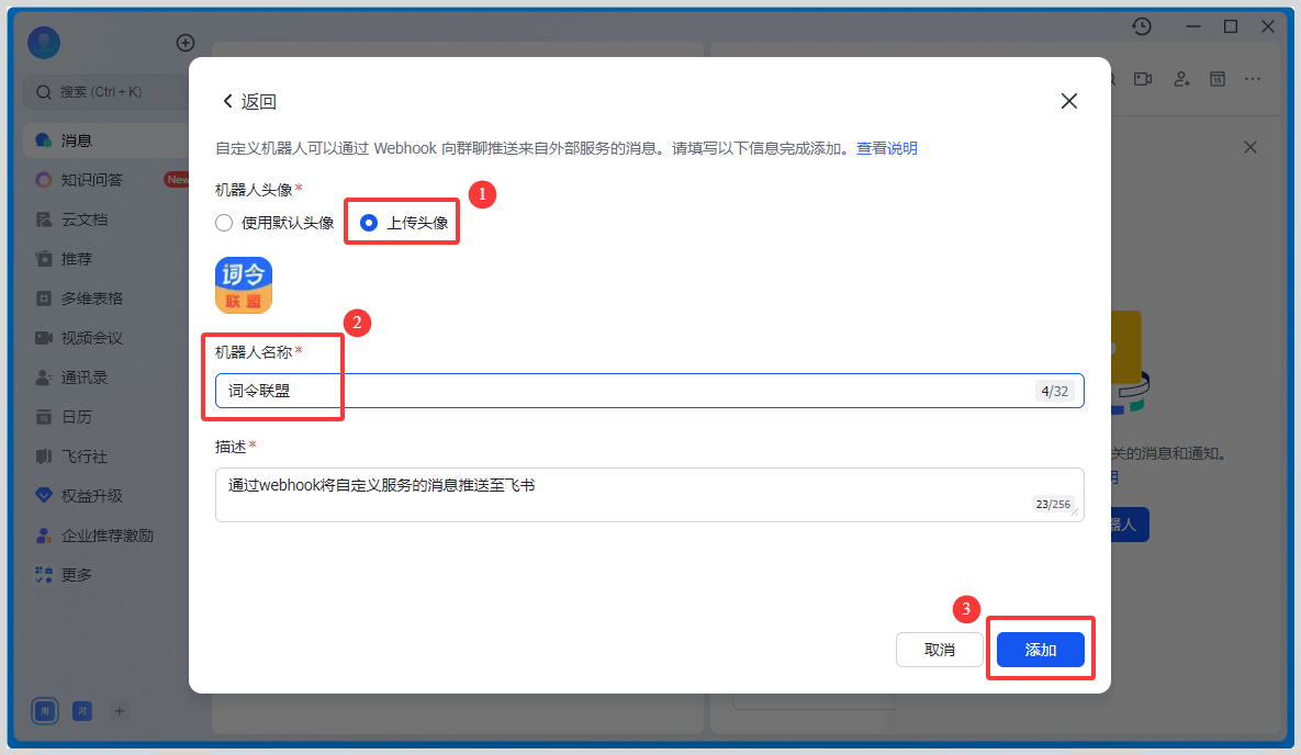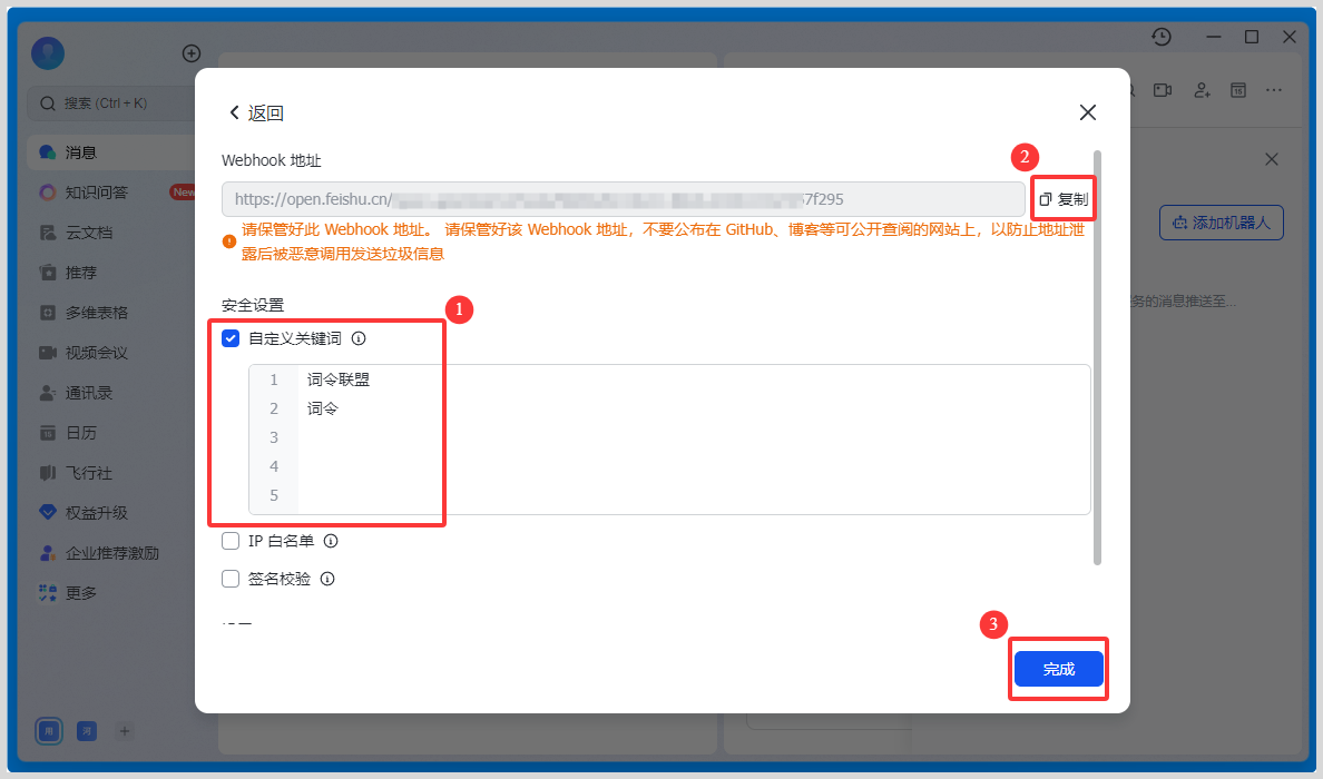 1、请保存好您的webhook链接,不要告知别人!别人知道webhook链接后也可以接收到推送给您的消息通知; 2、手机上安装飞书APP,登录同一个账号后,手机上也可以正常接收词令联盟推送的消息通知,且不需要单独设置。