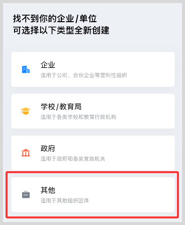 3、完成手机号绑定后,选择创建企业,选择其他。