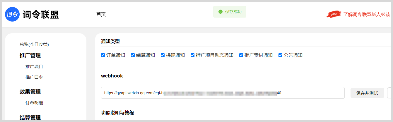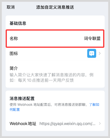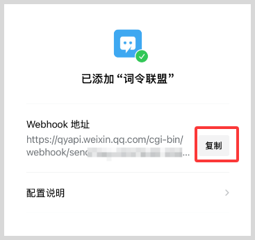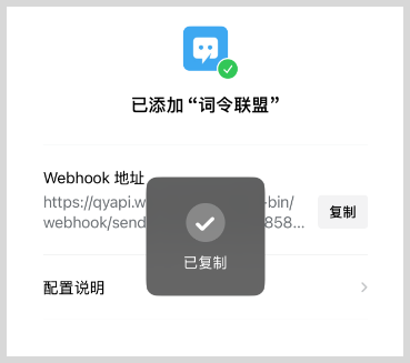 9、复制Webhook链接地址成功后,粘贴到词令联盟消息推送Webhook输入框内。
