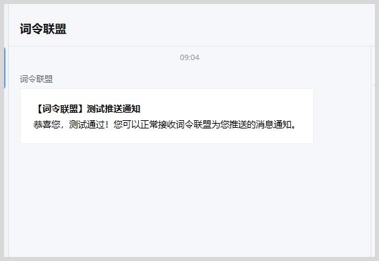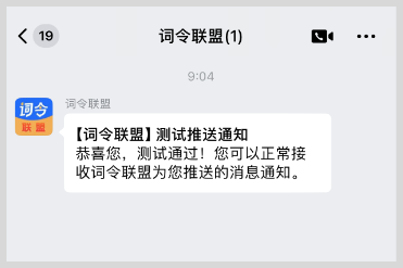 10、输入Webhook链接点击保存并测试,企业微信机器人成功接收到【词令联盟】测试推送通知,即表示您已成功添加企业微信机器人,后续可正常接收词令联盟为您推送的消息通知。