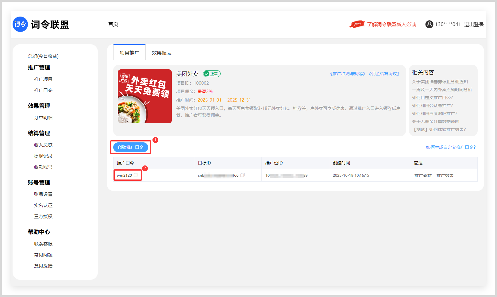 2.进入推广项目点击“创建推广口令”,同意协议后即可成功创建该项目推广口令。