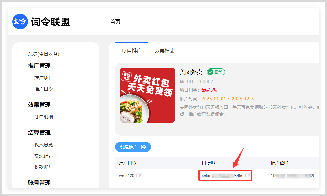 1.已在词令联盟创建推广项目的推广口令,获得推广项目的目标ID,点击复制目标ID。