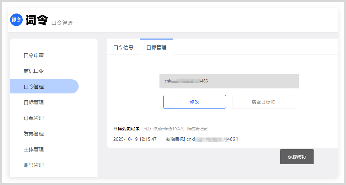 5.保存成功,该自定义口令与推广目标ID完成关联,即可使用自定义口令推广赚钱。