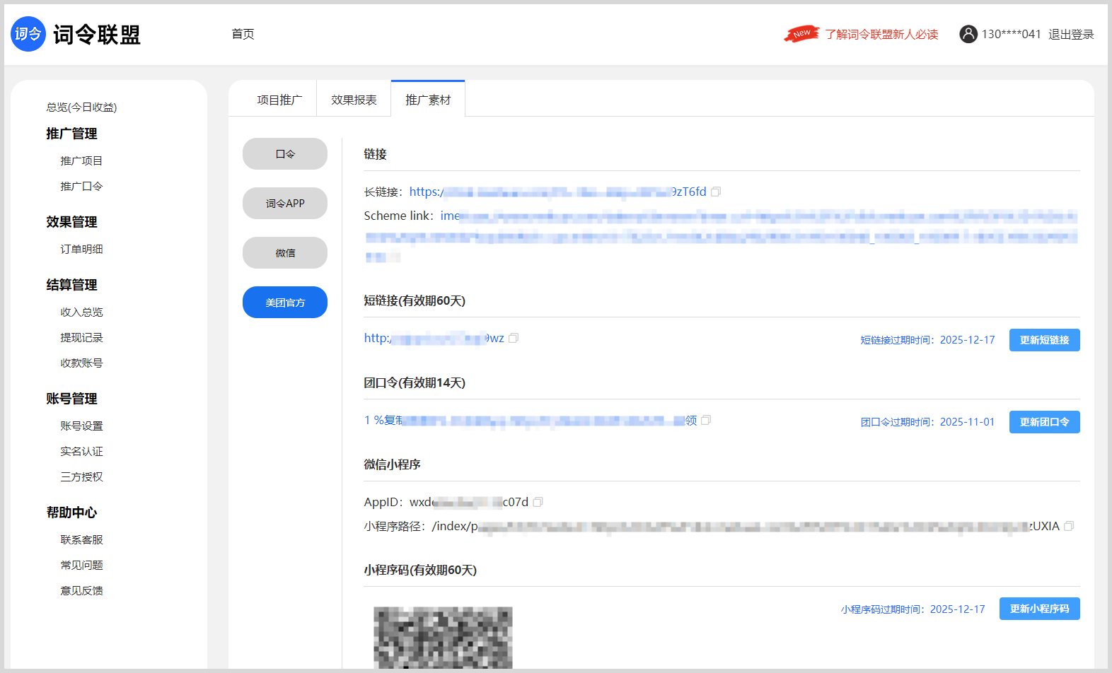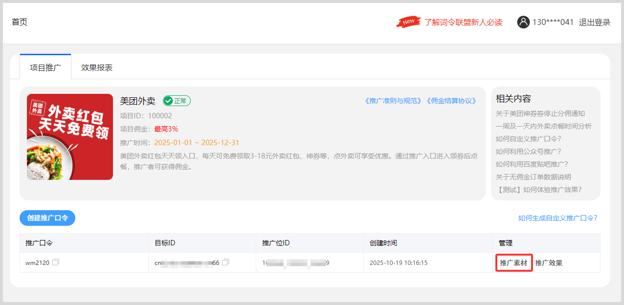 1.在词令联盟推广项目已创建推广口令后,找到“推广素材”入口点击进入。