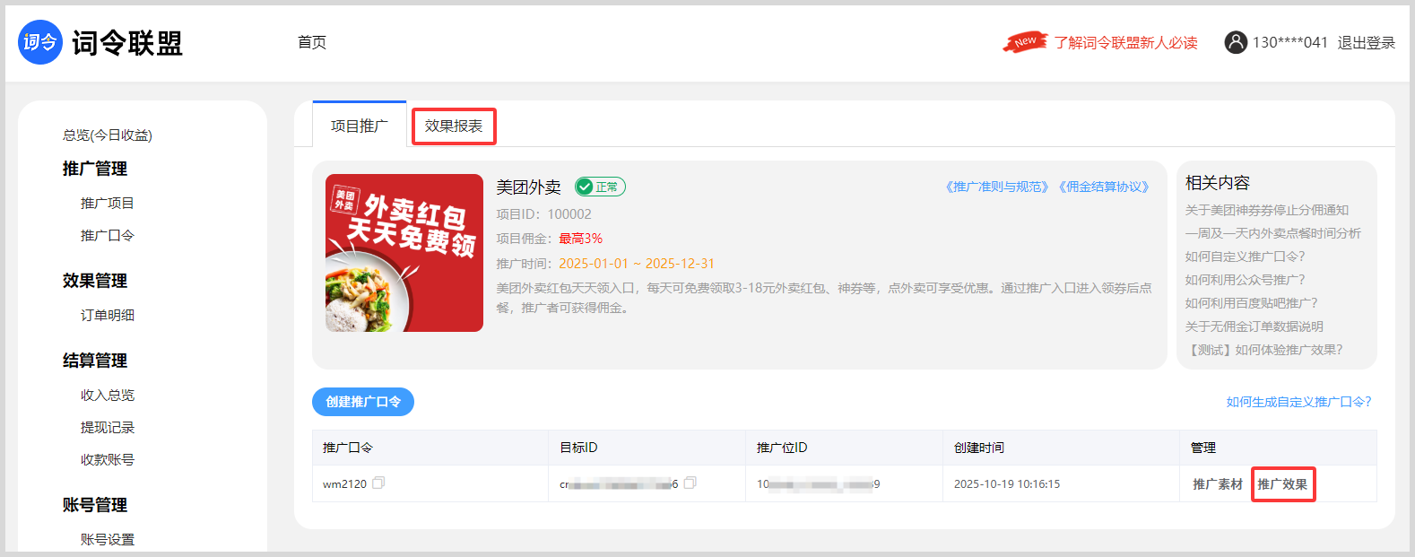 词令联盟推广效果是指通过推广产生有效的推广订单数据。推广效果有2处可以查询分别为:推广项目推广效果查询和词令联盟效果管理订单明细。