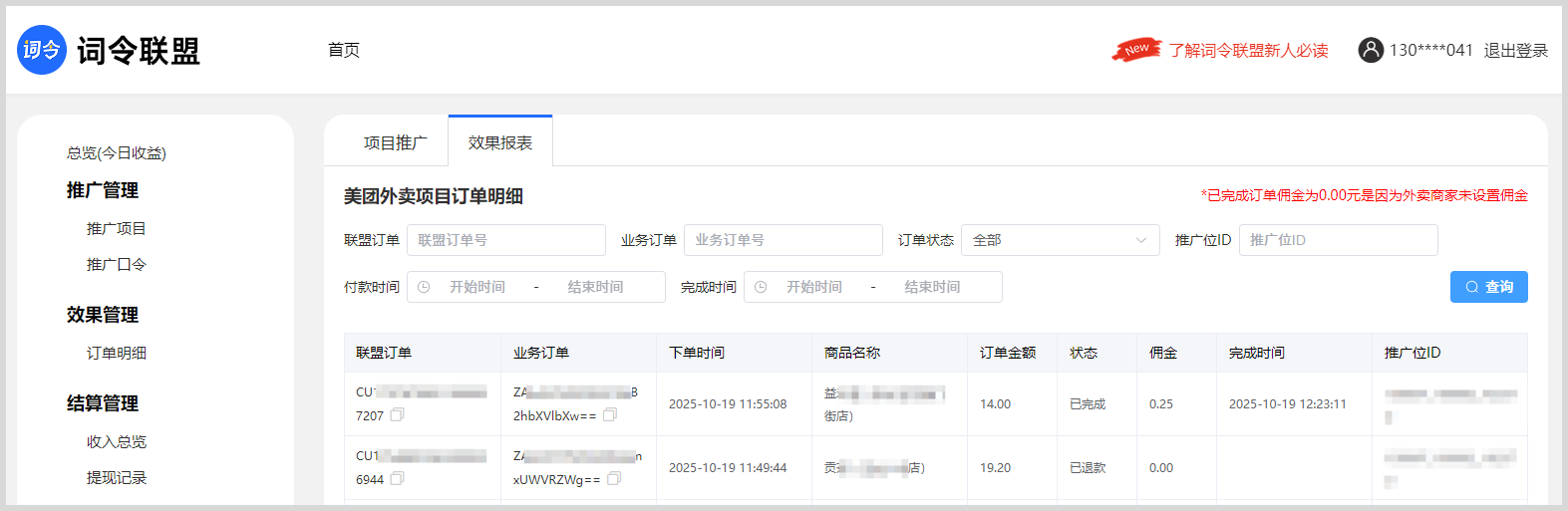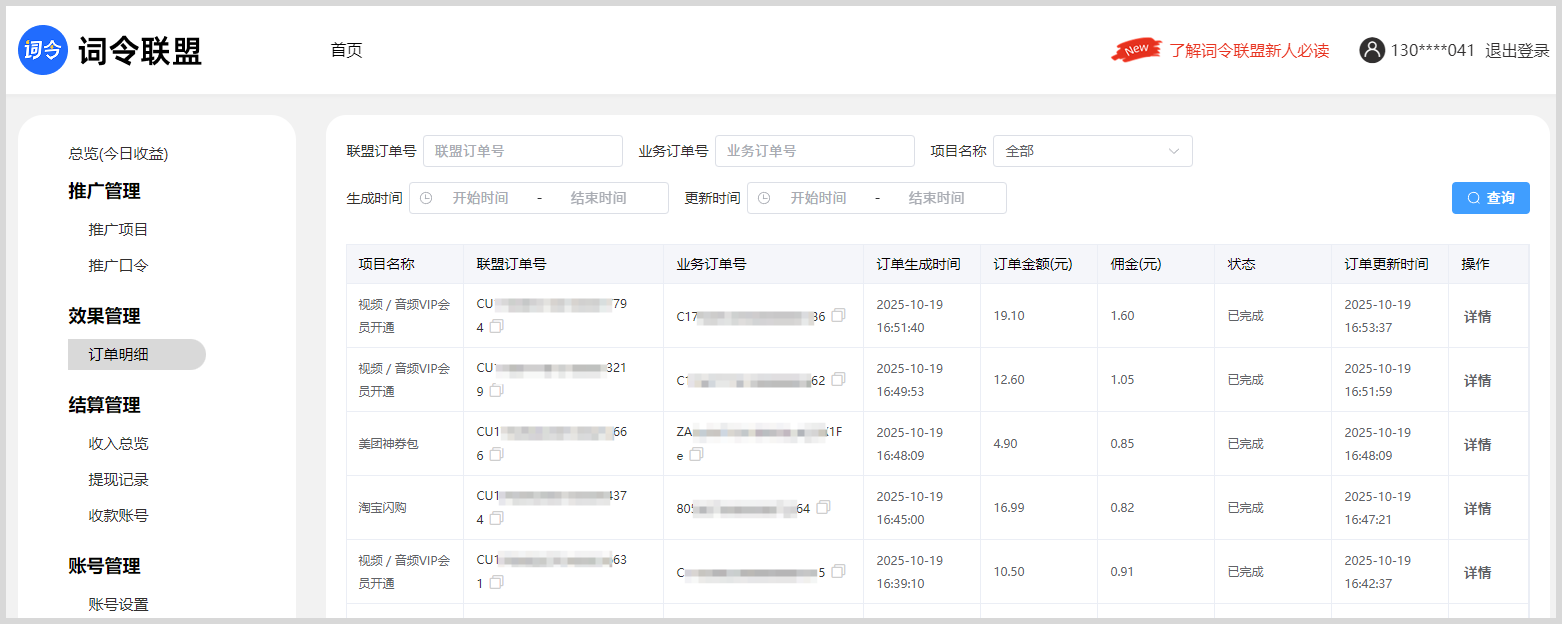 在词令联盟 > 效果管理 > 订单明细内可以查询到所有推广项目,最新产生的推广订单数据。点击订单后面的操作详情,可进入推广项目效果报表查询到推广订单更多的数据。