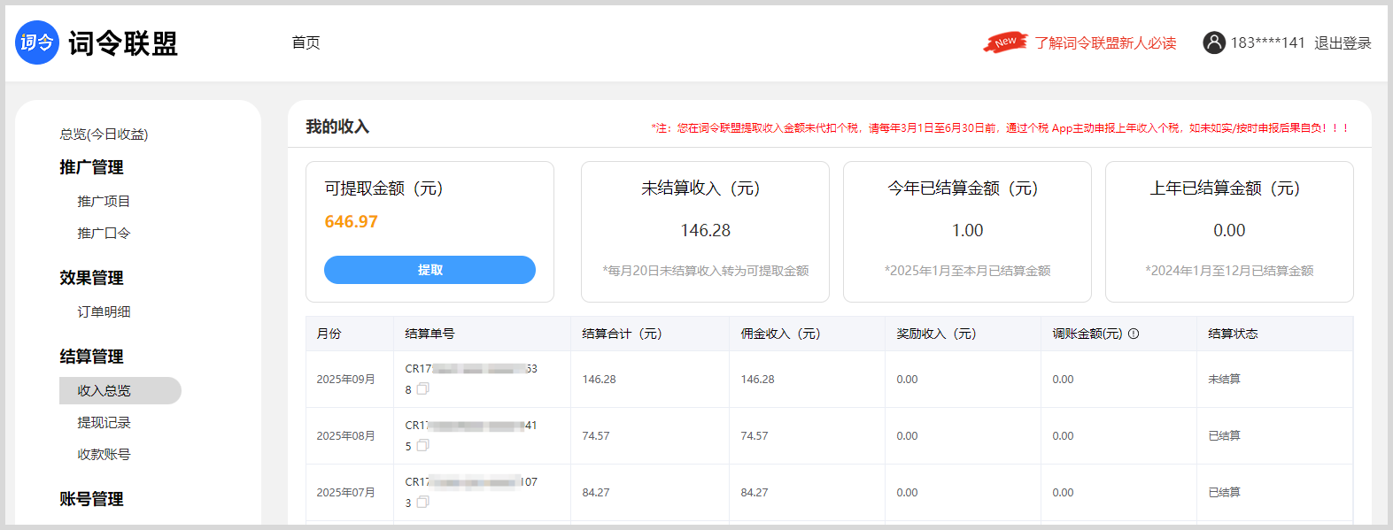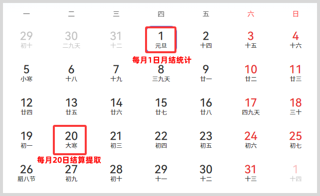 每月1日汇总计入未结算收入,在当月20日转为可提取金额等于或大于1元可申请提取。